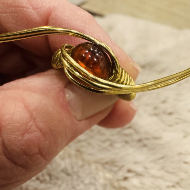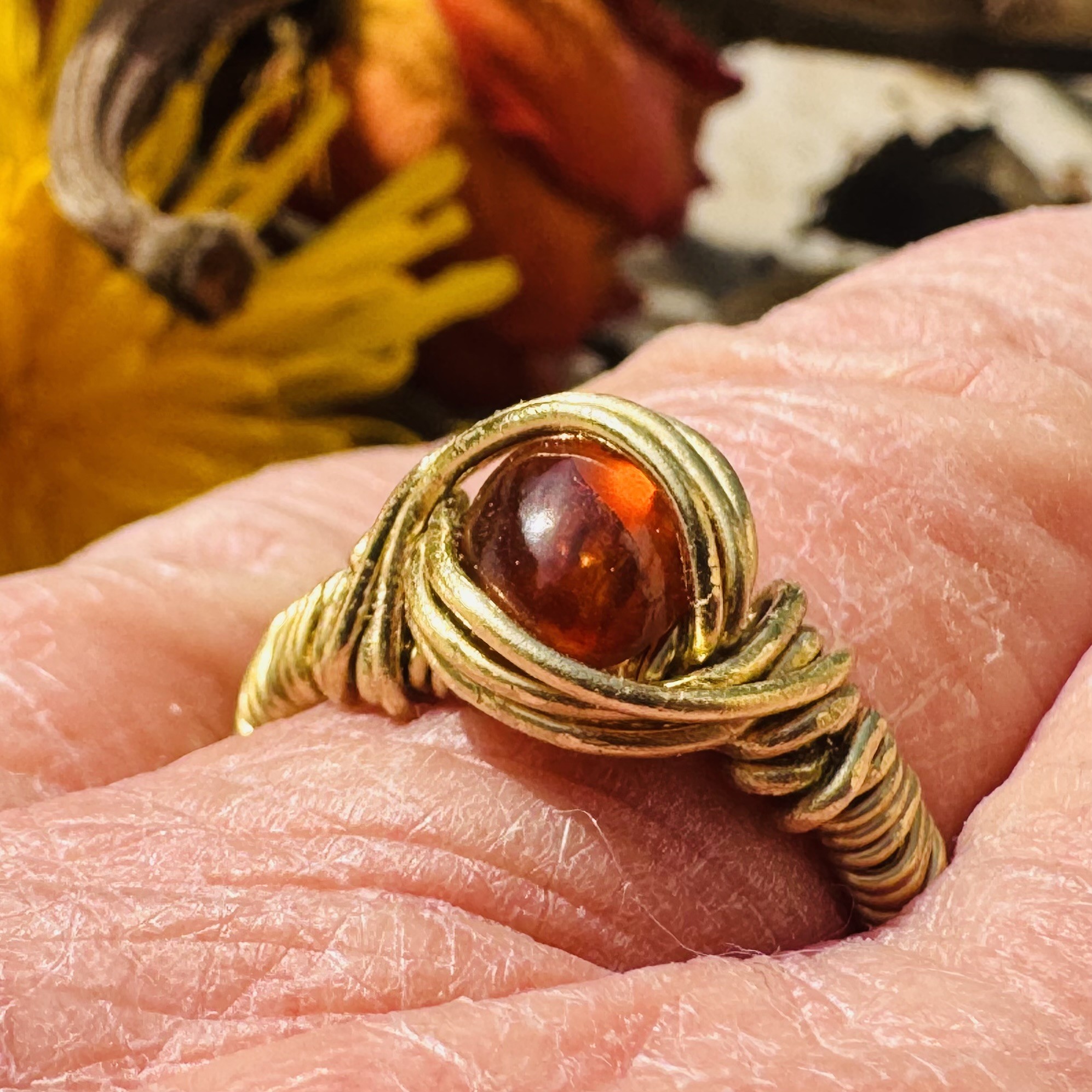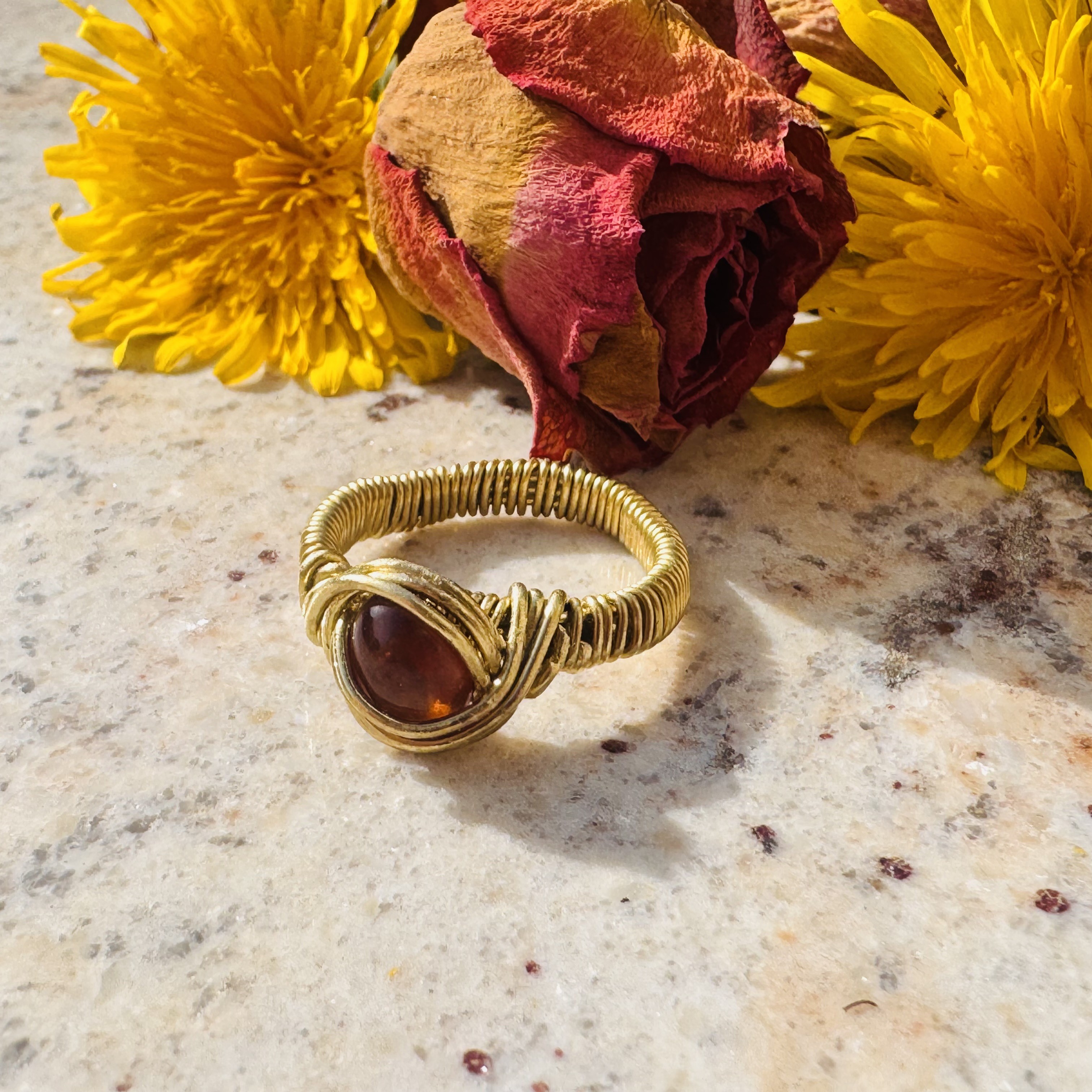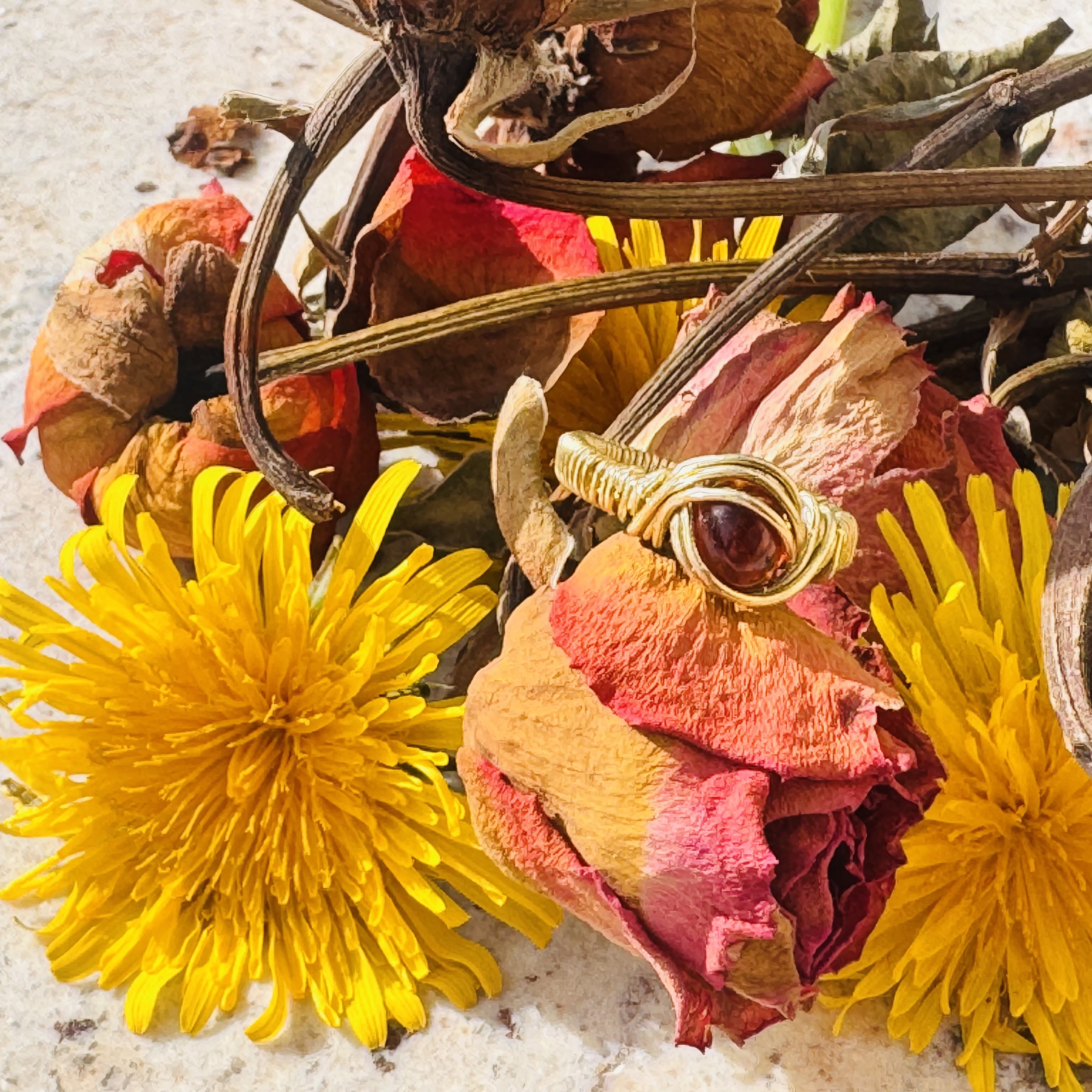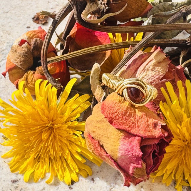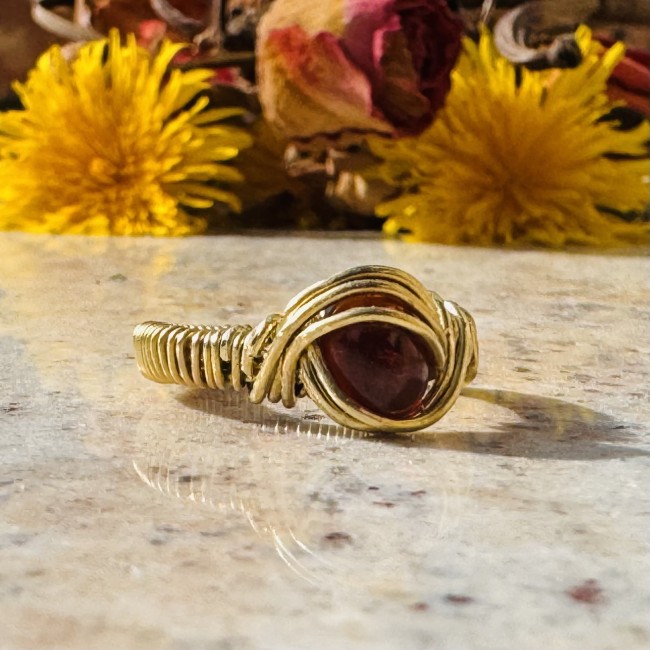 La bague est faite avec un grenat, entourée par du fil doré. Seul le fil forme la bague et maintient la pierre. C'est la technique du wire wrapping, le tressage de fil.
